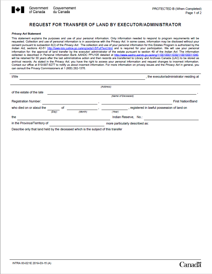 This form (Intra 83-021E; 2 pages) requests a transfer of land. For details, refer to How to Process a Land Transfer.